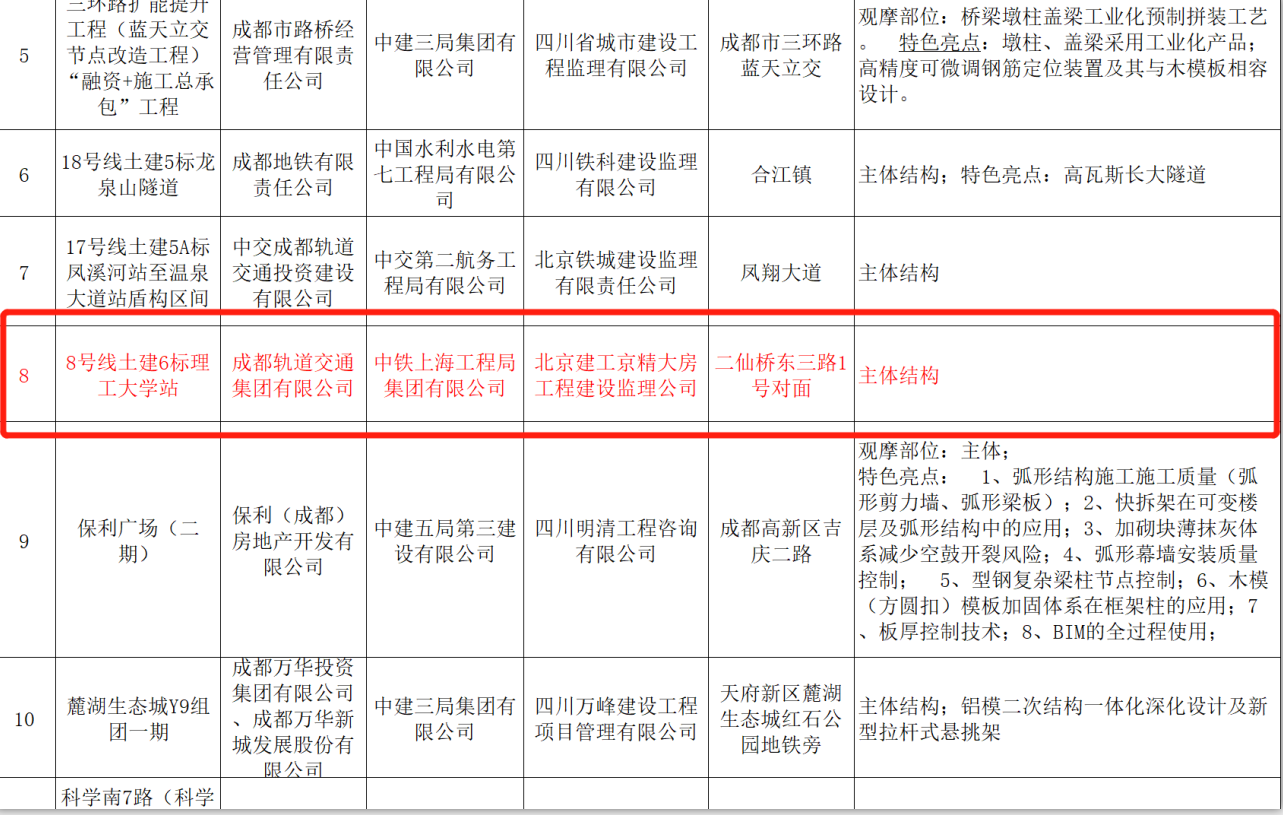 成都軌道交通8號(hào)線6標(biāo)理工大學(xué)站榮獲成都市優(yōu)質(zhì)示范工程
