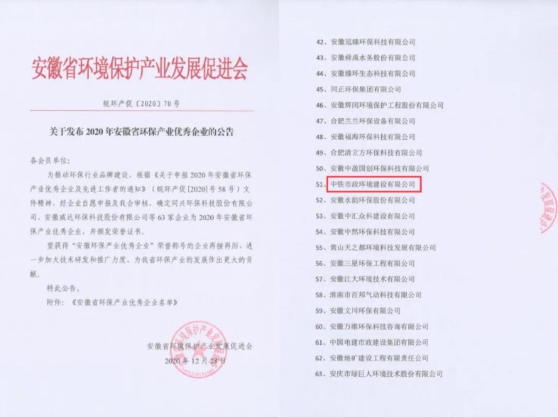 2020年12月,安徽省環(huán)境保護產業(yè)發(fā)展促進會發(fā)布“2020年安徽省環(huán)保產業(yè)優(yōu)秀企業(yè)”公告、“2020年安徽省AAA級環(huán)保施工示范工地”通知及“2020年安徽省環(huán)保產業(yè)優(yōu)秀企業(yè)及先進工作者”的公告。