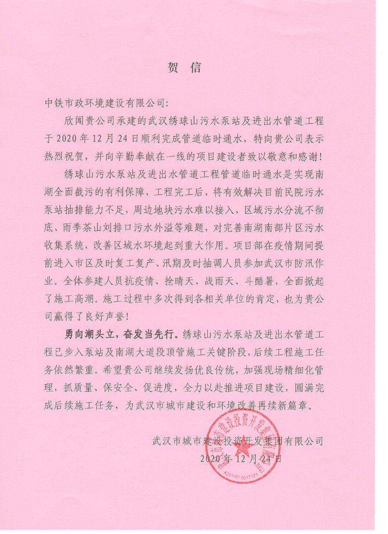 2020年12月24日,武漢繡球山污水泵站及進(jìn)出水管道工程項目部順利完成管道臨時通水。自項目施工以來,全體參建人員抗疫情、搶晴天、戰(zhàn)雨天、斗酷暑,全面掀起施工高潮,施工過程中多次得到各相關(guān)單位的肯定。工程完工后,南湖全面截污將得到有利保障,有效解決目前民院污水泵站抽排能力不足,周邊地塊污水難以接入,區(qū)域污水分流不徹底、雨季茶山劉排口污水外溢等難題,對完善片區(qū)污水收集系統(tǒng)、改善區(qū)域水環(huán)境起到重大作用。為此,武漢市城市建設(shè)投資開發(fā)集團(tuán)有限公司發(fā)來賀信。